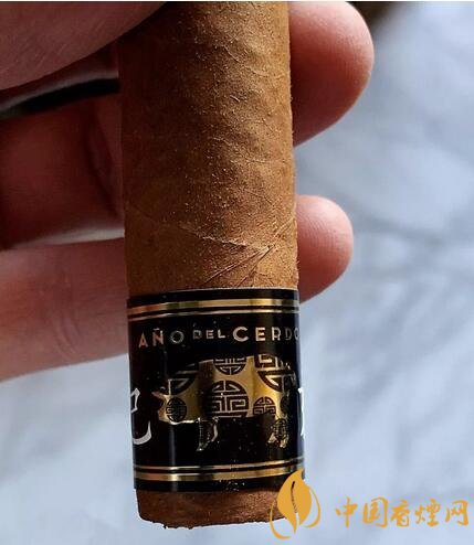 高希霸生肖雪茄并非特制的雪茄,使用的是醇化數(shù)年的量產(chǎn)雪茄,例如去年的高希霸狗年魔術(shù)師使用的是老標(biāo)的高希霸魔術(shù)師,今年的高希霸羅布圖同樣使用醇化數(shù)年的雪茄。雪茄尺寸是50環(huán)徑,4.7英寸,今年的發(fā)行量是3000盒。雪茄有兩個煙標(biāo),一個是高希霸的標(biāo)準(zhǔn)煙標(biāo),一個是帶有中國生肖豬年標(biāo)識的腳標(biāo),雪茄盒子也是特制的,黑色漆盒右下角有一個豬的標(biāo)識。