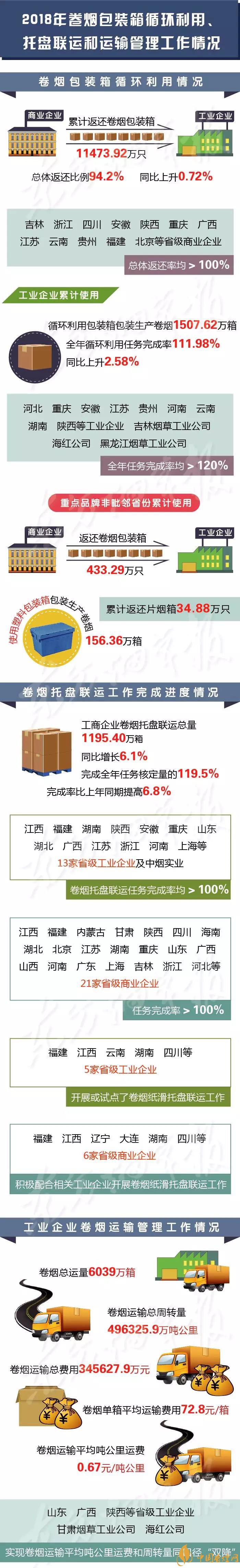 1月29日,國家煙草專賣局通報(bào)了2018年度卷煙包裝箱循環(huán)利用、卷煙托盤聯(lián)運(yùn)及卷煙運(yùn)輸管理工作情況(一圖速覽↓↓↓)。