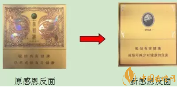 設(shè)計(jì)改版:黃鶴樓1916感恩香煙整體顏色改為鎏金色彩,反面圖案進(jìn)行了簡化,畫面僅有南洋兄弟頭像和“1916”標(biāo)識(shí),盒型由原來的橫推升級(jí)為全開。