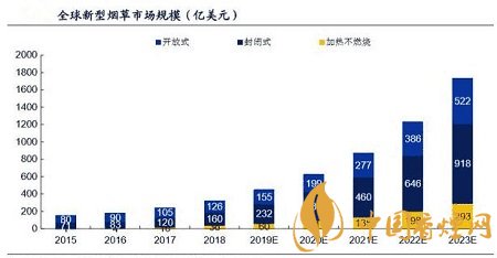 與傳統(tǒng)卷煙市場(chǎng)衰退呈鮮明對(duì)比的是新型煙草市場(chǎng)規(guī)模的逐年提升。全球新型煙 草市場(chǎng)規(guī)模以 27.9%的復(fù)合年增長(zhǎng)率從 2013 年的 94 億美元迅速增加至 2018 年的 323 億美元。弗若斯特沙利文預(yù)計(jì)到 2023 年全球新型煙草市場(chǎng)規(guī)模將高達(dá) 1734 億美元。新型煙草煙作為一種替代香煙的電子產(chǎn)品,有著與香煙類(lèi)似的外 觀、煙霧、味道和感覺(jué)。而與香煙相比卻不含有香煙煙霧中的 7000 種有害化學(xué) 成分,因此受到越來(lái)越多人的青睞。