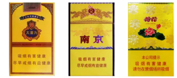 在中國傳統(tǒng)審美中,富貴金色是權(quán)貴階層的代表色彩,那么,高端香煙頻繁出現(xiàn)金色包裝就不足為奇了。2018卷煙流行色的從以下幾款就可以看出:例如,云煙(大重九)、南京(九五之尊)、鉆石(金一品荷花)等。