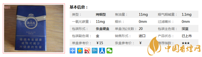 555配方555·金這款香煙香醇正,沉溢半濃,芬芳留長,煙氣柔和淡雅。這款煙受爭議較多,但是市場還是有的,老手值得品吸一下,新手慎入。據(jù)小編市場調(diào)查所知,555配方555·金售價定為15元/包。