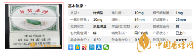 類型 :烤煙型 焦油量 :10mg 煙氣煙堿量 :1mg 一氧化碳量 :10mg