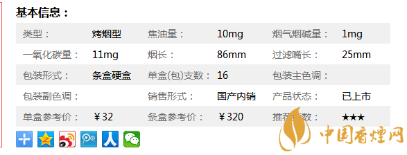 類型 :烤煙型 焦油量 :10mg 煙氣煙堿量 :1mg 一氧化碳量 :11mg
