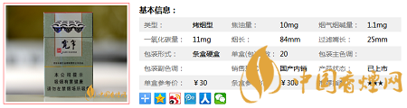 類型 :烤煙型 焦油量 :10mg 煙氣煙堿量 :1.1mg 一氧化碳量 :11mg
