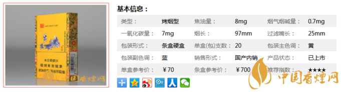 類型 :烤煙型 焦油量 :8mg 煙氣煙堿量 :0.7mg 一氧化碳量 :7mg