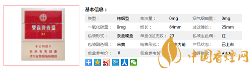 | 類型 :烤煙型 | 焦油量 :10mg | 煙氣煙堿量 :1mg | 一氧化碳量 :11mg |