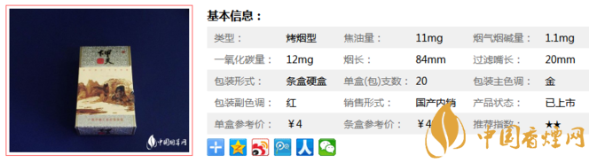 類型 :烤煙型 焦油量 :11mg 煙氣煙堿量 :1.1mg 一氧化碳量 :12mg