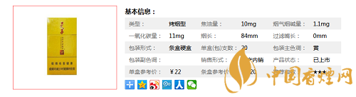 類型 :烤煙型 焦油量 :10mg 煙氣煙堿量 :1.1mg 一氧化碳量 :11mg