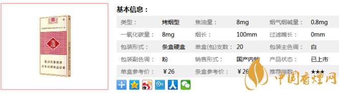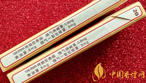類型 :烤煙型 焦油量 :8mg 煙氣煙堿量 :0.8mg 一氧化碳量 :8mg