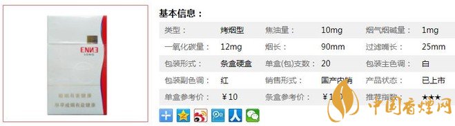 | 類型 :烤煙型 | 焦油量 :10mg | 煙氣煙堿量 :1mg | 一氧化碳量 :11mg |