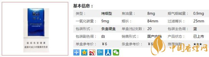 | 類型 :烤煙型 | 焦油量 :8mg | 煙氣煙堿量 :0.9mg | 一氧化碳量 :9mg |