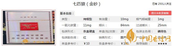 七匹狼金砂煙支長84mm,過濾嘴:25mm,這款七匹狼的包裝款式簡潔大方,煙氣飽滿充足,降焦不夠明顯,但是沒什么香氣,勁道適中,口感比較一般,入口有點(diǎn)雜氣,入喉有點(diǎn)刺激感,感覺沒什么特色,味道平和普通。下面我們一起來看七匹狼金砂的參數(shù)信息:焦油量:10mg 煙堿量:1mg 一氧化碳量:11mg