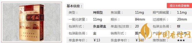 類型 :烤煙型 焦油量 :10mg 煙氣煙堿量 :1.1mg 一氧化碳量 :12mg