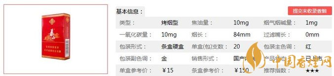 類型 :烤煙型 焦油量 :10mg 煙氣煙堿量 :1mg 一氧化碳量 :10mg