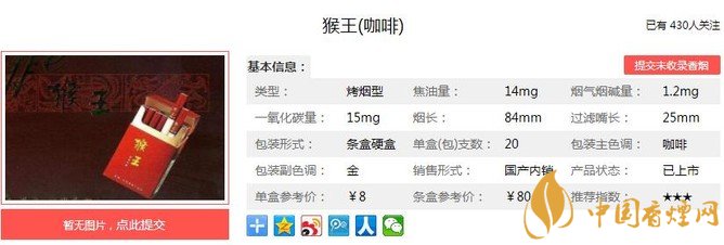 猴王咖啡煙支長84mm,過濾嘴長:25mm,煙支美觀高雅,“猴王”漢字豎排;使用羅紋卷煙紙、加長燙金接裝紙。下面我們一起來看猴王咖啡的參數(shù)信息:焦油量:14mg 煙堿量:1.2mg 一氧化碳量:15mg