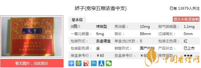 寬窄五糧濃香中支煙支長88mm,水松紙上有兩排降焦孔,煙絲油潤度不錯但稍有碎末,切口整齊。煙支拿在手里十分精致舒適。下面我們一起來看寬窄五糧濃香中支的參數(shù)信息:焦油量:10mg 煙堿量:1.1mg 一氧化碳量:9mg