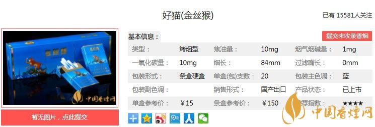 一、好貓金絲猴香煙價格
