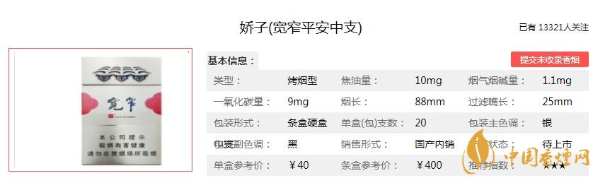 做為寬窄系列家族新成員,嬌子(寬窄平安中支)也已登臺亮相。在寬版粗支、細支、短支等測試版本之后,最終推出了中支版本的平安,并在2018年驚艷上市。味道傳承了寬窄系列的細膩典雅,又有其自身的溫潤柔媚,是一款質(zhì)高價美的卷煙產(chǎn)品。經(jīng)小編市場調(diào)查嬌子(寬窄平安中支)售價為40元/包。