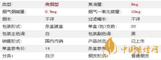 | 類型 :烤煙型 | 焦油量 :8mg | 煙氣煙堿量 :0.9mg | 一氧化碳量 :10mg |