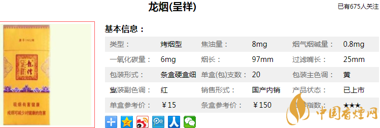 作為一款零售價格150元/條的細支卷煙,龍煙(呈祥細支)所用配方與哈爾濱龍煙(系列)價格表零售價550元/條的“龍煙(祥和)”以及零售價320元/條的龍煙(萬福)相當。