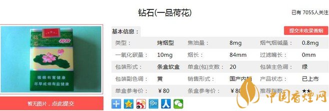 鉆石一品荷花于2014年上市,在高端卷煙市場占用很大的份額,濃淡適中的香氣,勁頭適中成為很多人的口糧。清雅脫俗的包裝設(shè)計更讓人愛不釋手,經(jīng)香煙網(wǎng)小編市場調(diào)查鉆石一品荷花售價為80元/包。