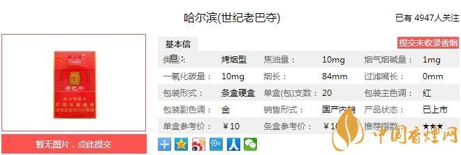 哈爾濱老巴奪煙支長(zhǎng)84mm,過(guò)濾嘴長(zhǎng)25mm,使用從植物中提取的天然香原料和天然植物保潤(rùn)技術(shù),保證卷煙舒適感;以清甜香風(fēng)格為基礎(chǔ),采用創(chuàng)新性中支(7.0mm)規(guī)格,在保證滿足感前提下,注重?zé)熛愕拇己透?、舒適感和甜潤(rùn)感,同時(shí)兼顧卷煙安全性。下面我們一起來(lái)看哈爾濱老巴奪的參數(shù)信息:焦油量:10mg 煙堿量:1.0mg 一氧化碳量:10mg