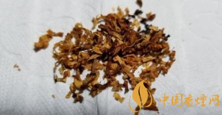 煙絲以明黃為主,輔以少量的棕黃色煙絲,顯然是不同兩種不同品級的原片切絲混合而來,間雜有切得較細(xì)、揉捻的比較柔軟的煙梗。配方調(diào)和與現(xiàn)款零售版基本一致。