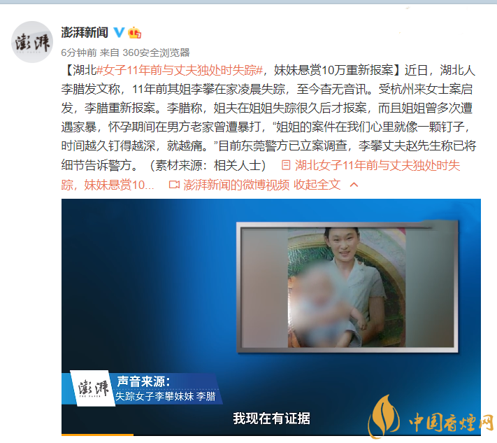 以上就是對(duì)湖北女子11年前與丈夫獨(dú)處時(shí)失蹤,妹妹重新報(bào)案的事件報(bào)道,具體事件發(fā)展還要等警方調(diào)查結(jié)果,后續(xù)發(fā)展我們將繼續(xù)跟進(jìn)。想了解更多時(shí)事熱點(diǎn),請(qǐng)關(guān)注香煙網(wǎng)!