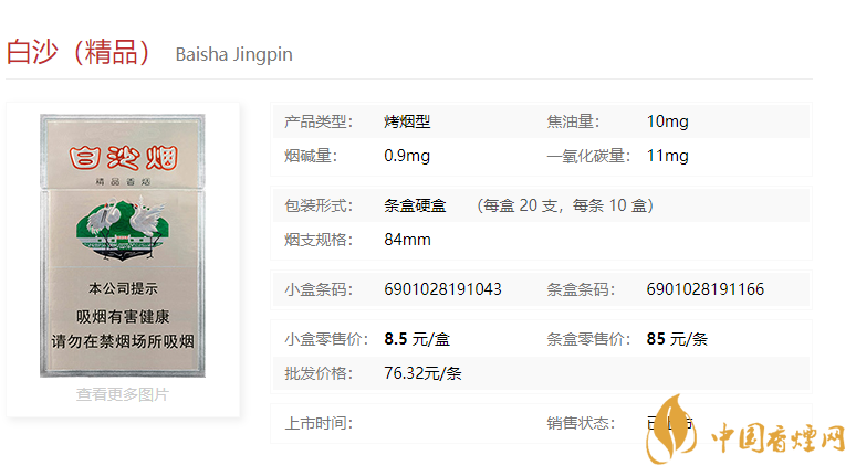 精品白沙,烤煙型,中高檔卷煙,中國醇和派的領(lǐng)飛者。1995年面市以來,產(chǎn)品深得消費(fèi)者的喜愛,銷量增長迅猛,亦是全國中高檔煙市場的主要牌號之一。精品白沙,外包裝延用“白沙”牌卷煙外包裝圖案,采用高檔銀卡紙,經(jīng)壓凸套印來突出商標(biāo)的主體圖案及品牌形象,格調(diào)高雅、新穎,裝璜精美,成為企業(yè)效益增長的主要來源。吸味醇和、香氣濃郁、清雅豐滿、余味純凈、舒適。
