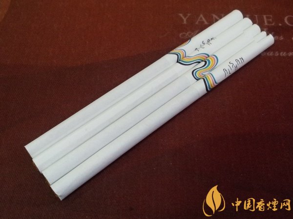 煙支通體純白,白到卷煙紙上連豎的或是橫的紋理都沒有。白色的水松紙上除了阿里山的Logo外,還飄蕩著一條“藍(lán)白紅白黃白藍(lán)白黑”的“幾”字形絲帶,很是奪目。