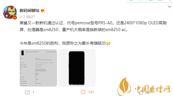 “黑鯊又一款新機(jī)通過認(rèn)證,代號penrose型號PRS-A0。還是2400*1080p OLED高刷屏,處理器是sm8250,量產(chǎn)機(jī)大概率是換新裝的sm8250 ac。”