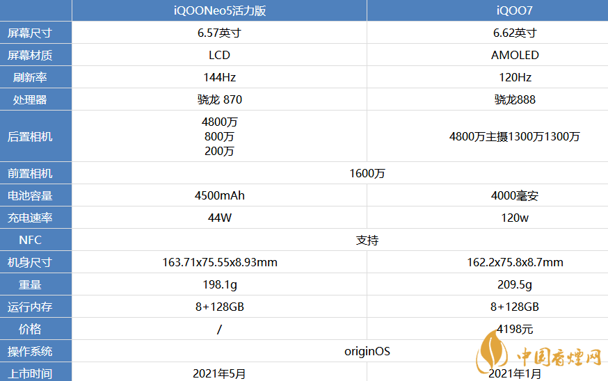以上就是香煙網小編為大家?guī)淼腝OONeo5活力版和iQOO7參數配置對比相關資訊,以上資訊全來自網絡,更多最新最實用的資訊請持續(xù)關注香煙網。