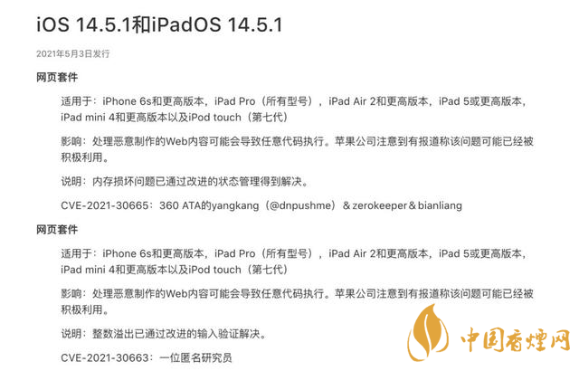 漏洞可被利用制作惡意網(wǎng)頁內(nèi)容導致任意代碼執(zhí)行,蘋果已在 iOS 14.5.1 系統(tǒng)上解決了該問題。