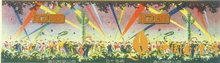 最為獨(dú)特的團(tuán)結(jié)主題煙標(biāo)莫過(guò)于貴陽(yáng)煙草公司出品的“祖國(guó)”煙標(biāo)。這枚出品于上世紀(jì)50年代的煙標(biāo),以橫長(zhǎng)的寬幅全景畫(huà)面,描繪了在彩色射燈的襯托下,我國(guó)各族人民歡聚于華表周?chē)M情舞蹈的宏大場(chǎng)面。
