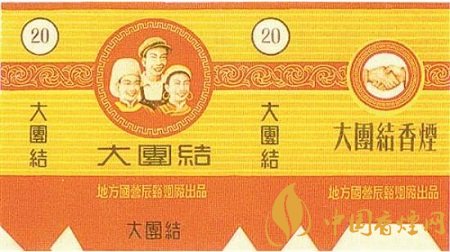 這一時(shí)期出品的“大團(tuán)結(jié)”煙標(biāo)也有很多,如太原煙草廠出品的“大團(tuán)結(jié)”煙標(biāo),主版于花卉圓圖內(nèi)印有“大團(tuán)結(jié)”字樣;地方國(guó)營(yíng)辰谿煙廠出品的“大團(tuán)結(jié)”煙標(biāo),主版圖案為兩名女性和一名男性的人物形象,副版是兩只手緊緊握在一起的畫(huà)面。