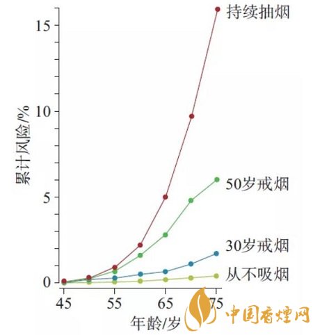 2004 年,著名的《英國癌癥雜志》 發(fā)表了經(jīng)典論文,詳細(xì)統(tǒng)計(jì)了英國等歐洲國家不同群體男性的肺癌死亡率。從圖上不難看出,75歲吸煙人群死于肺癌的概率是16%,比不吸煙人群高了將近50倍。換算一下,也就是說6個(gè)吸煙的人里面會有1位75歲之前就死于肺癌。更可怕的是,如果每天吸煙量超過5支,那么4個(gè)人里,就會有1位死于肺癌。