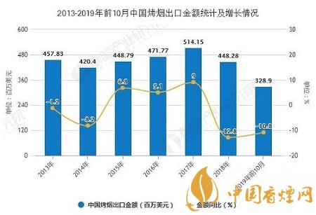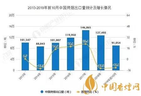 2019年前10月中國烤煙出口量突破9萬噸。據(jù)中國海關(guān)總署數(shù)據(jù)顯示,2019年10月中國烤煙出口量為6128噸。累計(jì)方面,2019年1-10月中國烤煙出口量達(dá)到91054噸,同比下降12.1%。