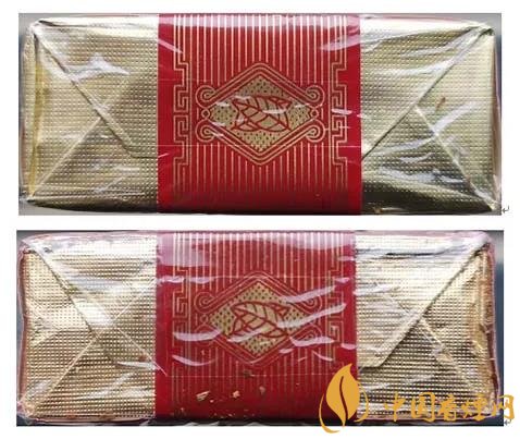 真品卷煙:1.封簽圖案印刷清晰,圖案及線條顏色明亮,線條印刷粗細相同。2.鋁箔紙顏色金色深,凹點均勻,距離適中。