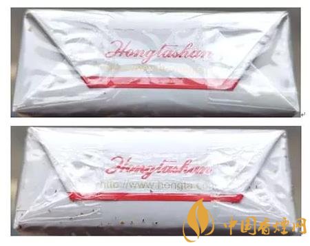 假冒卷煙:1.透明紙燙封收縮雜亂、死板,水汽較重。2.商標紙拐角折疊緊實,無空隙。(上真下假)