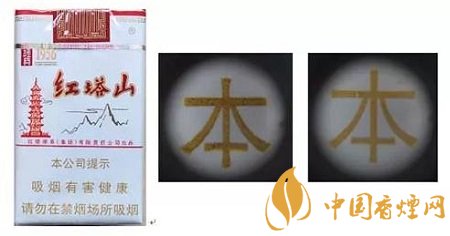 真品卷煙:紅塔印刷采用凹印,顏色交界邊緣有鋸齒痕跡;紅塔圖案紅色與淺黃色印刷清晰。