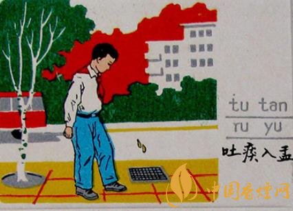 火花圖案采用宣傳畫的形式,人物形象生動(dòng)逼真,色彩鮮艷明快,具有濃郁的生活氣息。如一枚主題為“吐痰入盂”的火花(圖2)上,一位穿白襯衫系紅領(lǐng)巾的小男孩正彎著腰,對(duì)準(zhǔn)人行道的一口窨井吐入一口痰。背標(biāo)除一枚“精神文明”紅色橢圓篆印外,另有“小小一口痰,細(xì)菌千千萬(wàn)”的宣傳文字;還有一枚主題為“講衛(wèi)生”的火花上,一個(gè)揮舞著小紅旗的大爺,在綠樹(shù)成陰、高樓林立的繁華鬧市,正對(duì)一年輕家庭亂扔垃圾的行為進(jìn)行勸說(shuō)教育,旁邊佩戴紅袖章的大媽打掃著他們隨手丟棄的雜物,小女孩則在一旁低頭認(rèn)錯(cuò)。副標(biāo)上“違章必罰”的紅色篆印十分醒目。通過(guò)小小的火柴,科學(xué)宣傳防疫知識(shí),提高公眾自我保護(hù)意識(shí),早宣傳,早預(yù)防,起到了事半功倍的作用。