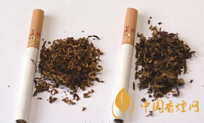 煙支過濾嘴及煙絲差異對比:真煙煙支采用單一醋纖濾嘴,長度為25mm,煙絲切絲寬度均勻,煙絲疏松、光澤油潤性好、呈檸檬黃色、含碎末少,煙絲結(jié)構(gòu)為葉絲、膨脹葉絲、膨脹梗絲和再造煙葉;假煙煙支過濾嘴較短,長度約為20mm,制絲工藝粗糙,色澤發(fā)暗無光澤、呈青褐色、煙絲中含碎末較多,大量梗絲未經(jīng)過膨脹處理,一般無膨脹葉絲和再造煙葉,與真品特征存在明顯差異。