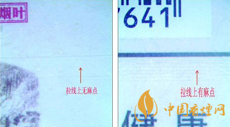 2、真品卷煙拉線有麻點(點狀膠痕),而假煙沒有。